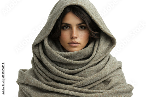 A woman wearing a large, soft scarf, exuding warmth and mystery against a white background.