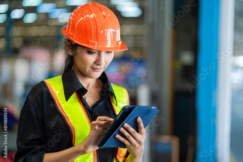 A woman wearing a safety vest and an orange helmet is looking at a tablet. She is likely a worker in a factory or warehouse, using the tablet to check information or instructions