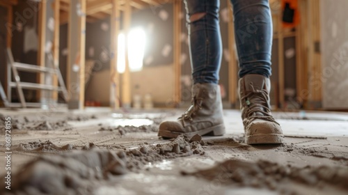 A woman, wearing boots and jeans, stands proudly on a newly laid screed floor, showcasing her expertise in interior construction