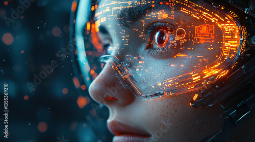 A woman wearing futuristic augmented reality glasses, immersed in a digital world of advanced technology.