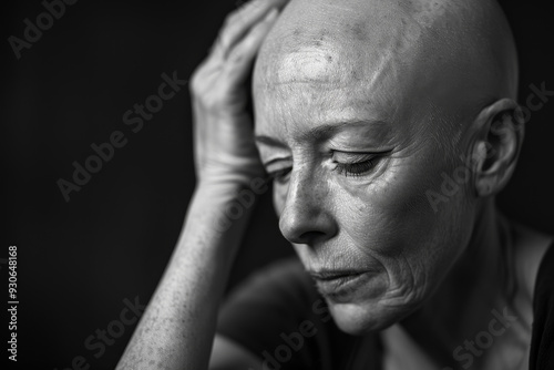 A woman with a bald head is looking down with her hands on her head