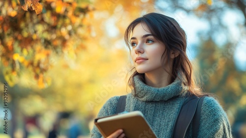 A woman with a focused look, holding a notebook, in a peaceful park setting with autumn leaves