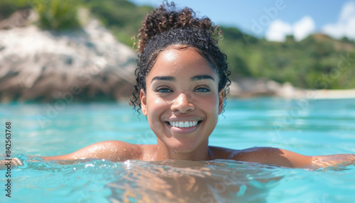 A woman with a joyful expression swimming in azure ocean waters under clear sky