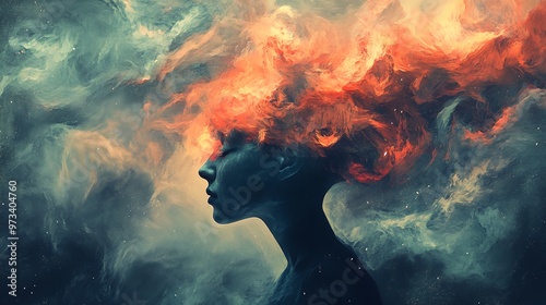 a woman with a red hair is in the midst of a cloud of fire and smoke