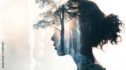 A woman with an intricately detailed tree superimposed over her head, symbolizing a deep connection with nature and growth. The tree branches intertwine with her hair, creating a stunning visual repre