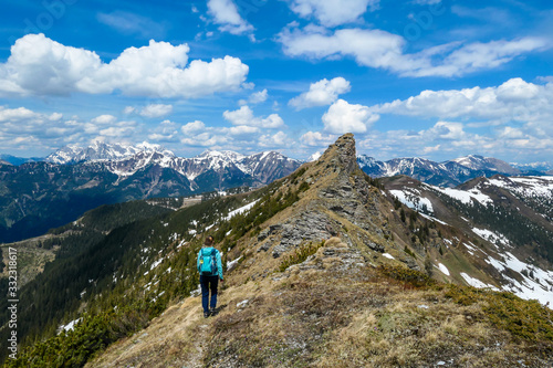 A woman with big hiking backpack hiking to Himmeleck peak, Austrian Alps. There is a massive mountain range in the back, partially covered with snow. Early spring vibes. Freedom and adventure.