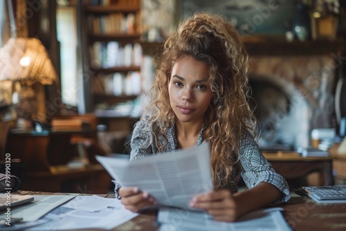 A woman with curly hair attentively reads through documents in an antique-styled study