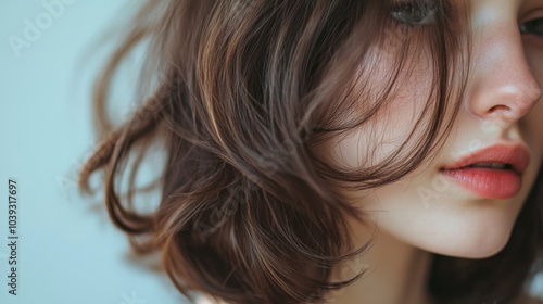 A woman with flowing brunette hair and soft features poses beautifully against a light blue backdrop, capturing a serene moment
