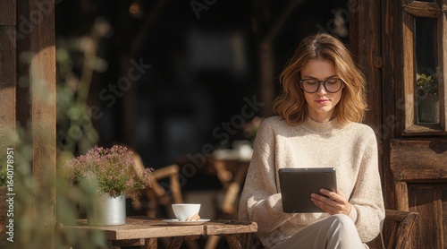 A woman with glasses is enjoying a peaceful moment outside, reading an ebook, with flowers, a cup, and wooden furniture nearby.