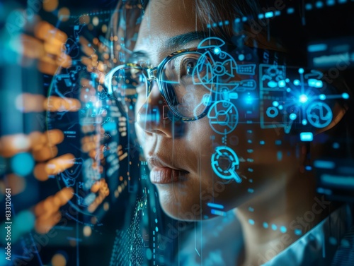 A woman with glasses looks intently at a screen filled with data and digital icons, representing the concept of data analysis and technology.