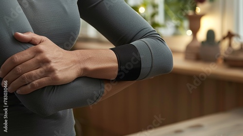 A woman with her arms crossed in front of a window, AI
