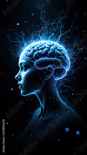 A woman with her head replaced by an AI-like interface, symbolizing artificial intelligence and human cognition.