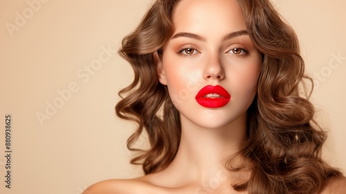 A woman with long brown hair and red lipstick is standing in front of a tan background. She has a confident and bold look on her face