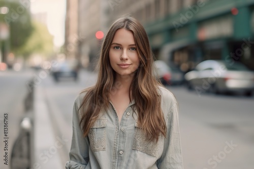A woman with long brown hair is standing on a sidewalk in front of a building