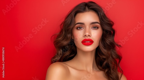 A woman with long red hair and red lipstick is standing in front of a red background. She has a confident and bold look on her face