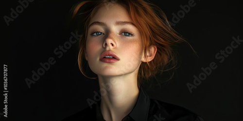 A woman with red hair and blue eyes is standing in front of a black background. She has a serious expression on her face