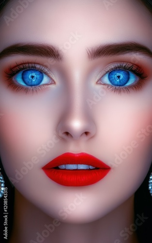 A woman with vibrant blue eyes and red lips gazes directly at the viewer. Her makeup enhances her features, creating a dramatic yet elegant look