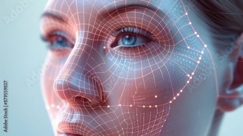 A woman's face is overlaid with a glowing digital grid, highlighting facial features.