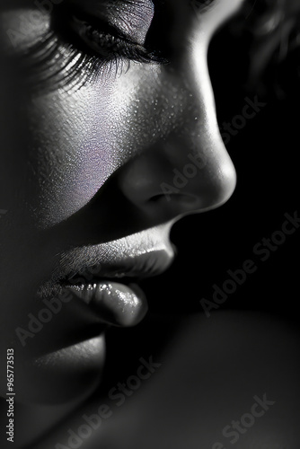 A woman's face is shown in a black and white photo, with her eyes closed and her mouth slightly open