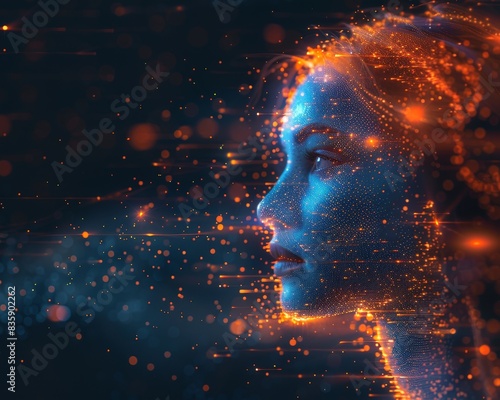 A woman's face is shown in a blurry, pixelated image with orange and blue colors
