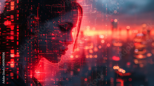 A woman's face is shown in a digital image with a city background. The image has a futuristic and abstract feel to it, with the woman's face appearing as a pixelated version of herself