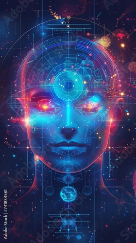 A womans face is shown in the foreground, with a futuristic interface displayed in the background. The interface features advanced technology and glowing digital elements