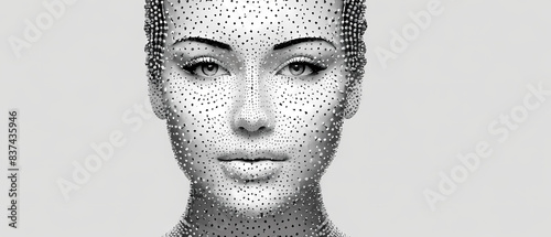 a woman's face is shown with dots in the shape of a head and a line of dots in the shape of a woman's head.