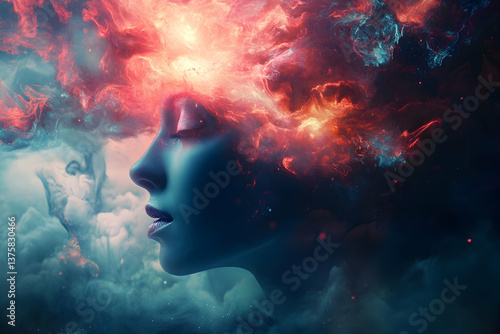 A woman's face merges with a cosmic explosion of light and color, symbolizing imagination, creativity, and inner power.