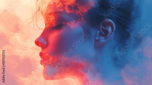 A Woman's Face Partially Hidden by Red and Blue Smoke