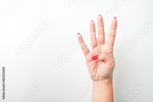 A woman's hand with bright red nail polish is making a raising four fingers gesture. Index, middle, Ring and little finger raise. Isolated on white background - Cut Out