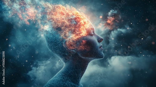 A Woman's Head Erupting in Sparks Against a Cosmic Background
