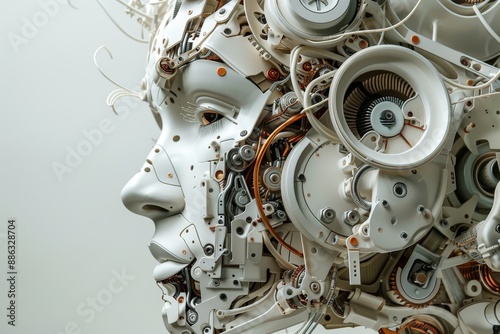 A womans head intricately crafted from gears and wires, merging human features with mechanical elements, Deconstructing the anatomy of mechanical systems into abstract shapes