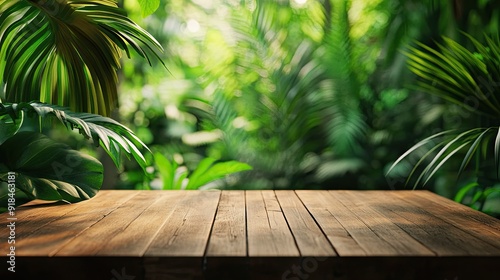 A wood tabletop podium floor set in a tropical garden, with blurred green leaves and plants creating a lush, natural background.