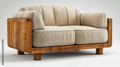 A wooden armchair with square sides and beige linen cushions on the seat