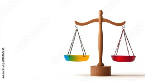 A wooden balance scale with colorful bowls, symbolizing justice, equality, and the weighing of options or decisions.