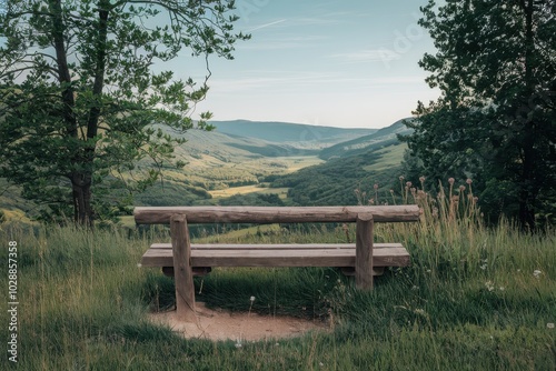 A wooden bench sits in a grassy field, overlooking a beautiful mountain range
