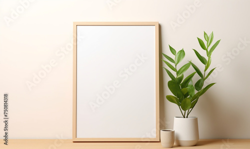 a wooden board and a framed poster mock up with green leaves on it сreated with Generative Ai