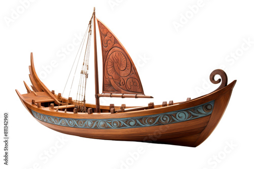 A wooden boat with a sail and a blue and green design. The boat is small and has a unique design