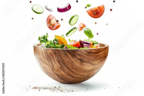 A wooden bowl with salad ingredients floating in the air Isolated on white background