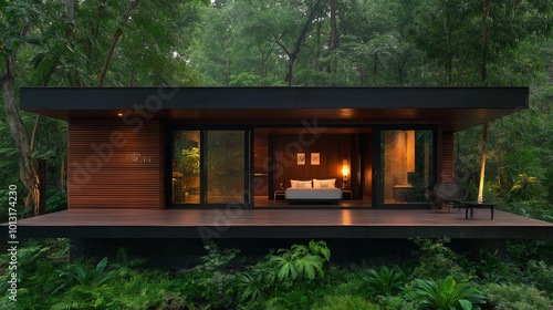 A wooden bungalow with vertical slats on the exterior walls, located in Thailand's verdant landscape. The structure features an open-air terrace and wood cladding that creates a rustic charm.