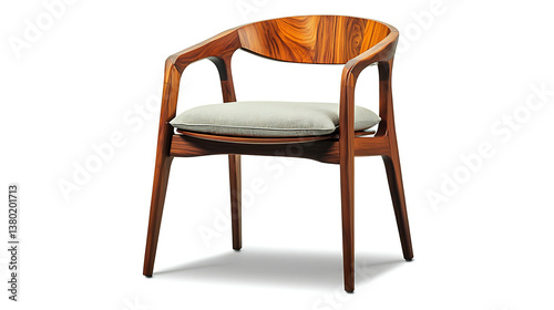 A wooden chair with a white cushion sits on a white background