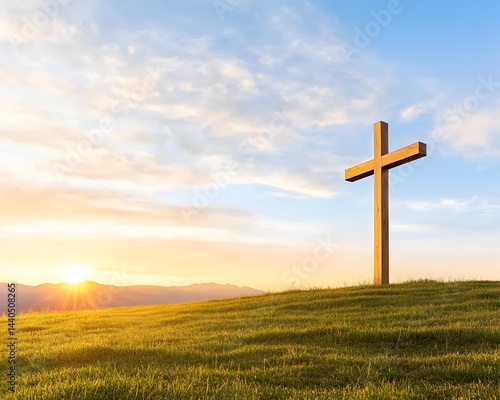 A wooden cross stands tall on a grassy hilltop, bathed in the warm glow of a setting sun against a vibrant sky