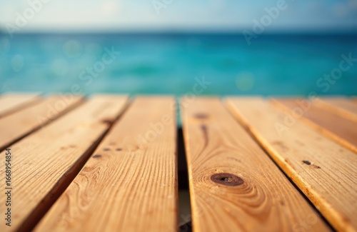 A wooden deck extends towards a blurred ocean background with a clear sky