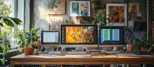 A wooden desk with three computer monitors, houseplants, and artwork on the wall in a creative workspace.