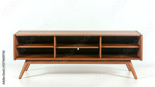 A wooden entertainment center with a white background