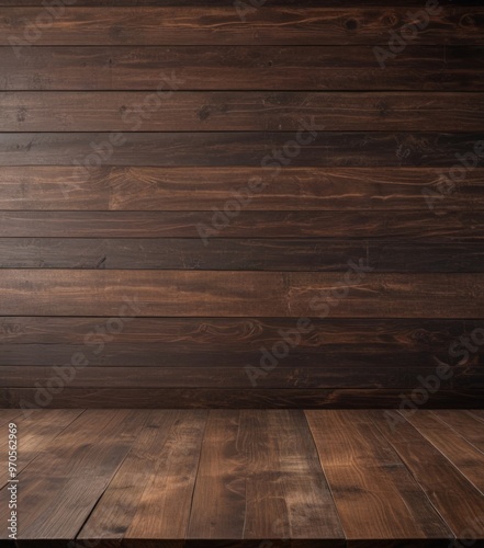 A wooden floor with a dark brown, weathered surface, set against a dark brown, vertical wooden wall.