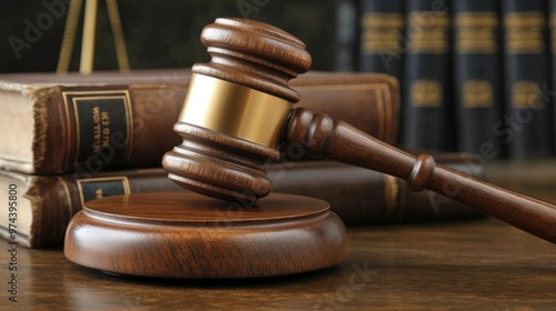 A wooden gavel placed on a desk next to law books, representing courtroom justice and legal power.