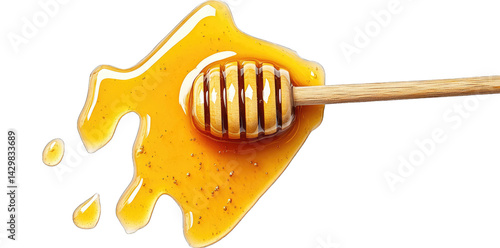 a wooden honey dipper rests on a pool of golden honey showcasing its viscous texture and natural sweetness. allure and culinary uses of honey
