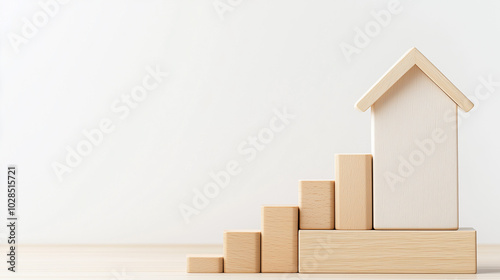 A wooden house is on top of a stack of wooden blocks