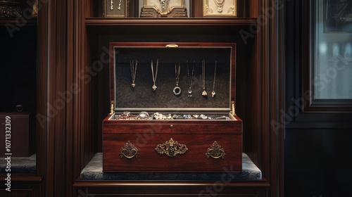 A wooden jewelry box with an assortment of necklaces and rings, open and displayed on a shelf.